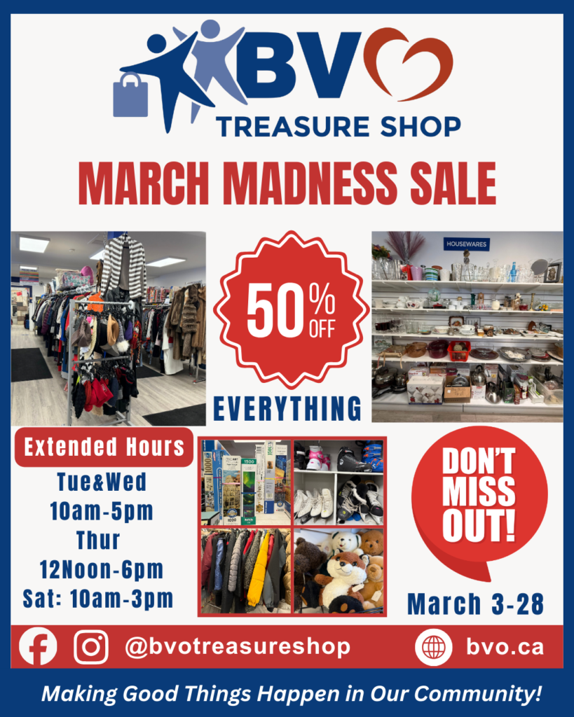 - Drop off your gently used donated goods to our Treasure Shop at BVO, 54 King Street East, Thornbury